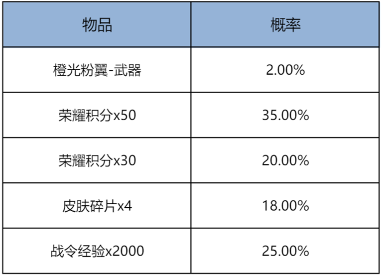 購買禮包必得酷炫機甲(1日),可額外隨機獲得以下之一:榮耀積分x50、榮耀積分x30、皮膚碎片x4、戰令經驗x2000、橙光粉翼-武器。累計50次必得橙光粉翼-武器。