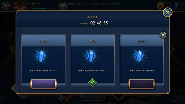 1、任務:在游戲的大廳頁面點擊任務可以查看每日任務,這里每天會為大家派出三個任務,完成任務后可以領取到相應的寶石獎勵。