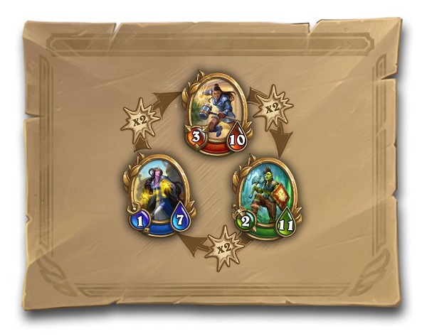 在這個模式里,不同職業間是存在雙倍傷害的克制關系的,紅色護衛克制綠色斗士,綠色斗士克制藍色施法者,藍色施法者克制紅色護衛,這種克制存在于所有的技能當中,即不管綠色施法者是用物理技能還是法術技能,都可以對紅色護衛造成雙倍傷害。