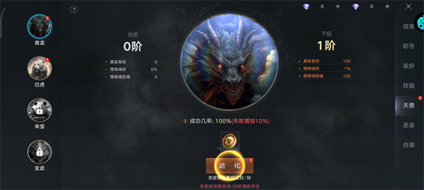 將天獸進(jìn)化,提升真實(shí)免傷、怪物減傷等屬性,增強(qiáng)生存能力,但需注意需要再進(jìn)化幾率100%在進(jìn)化【本系統(tǒng)深度較淺:20階滿級(jí)畢業(yè)】。