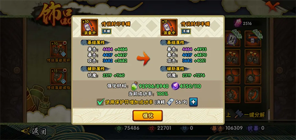 而且在游戲中,飾品與忍具的強化成功對于戰(zhàn)力提升尤為重要。以飾品為例,在強化時,除了消耗秘術(shù)之塵、秘術(shù)之星這些固定的道具外,還會消耗保護符,以提升強化成功率。如下圖所示:
