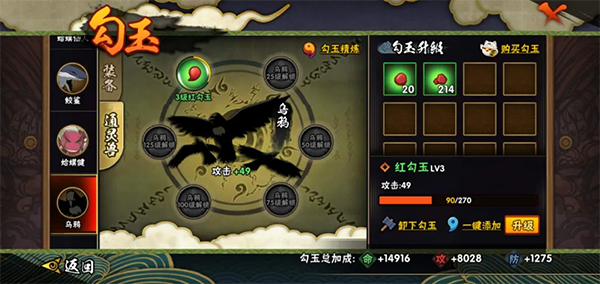 為裝備與通靈獸鑲嵌勾玉,并提升勾玉等級,均可提升戰(zhàn)力。