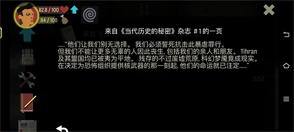 天空之山是一款很受歡迎的角色扮演生存類的手機(jī)游戲。是從端游上移植而來的,即便是在手機(jī)上也可以體驗(yàn)到游戲帶給你的魅力的。在游戲內(nèi)玩家將會(huì)扮演一位末日世界的幸存者的,需要你在這個(gè)充滿著變異喪尸的世界中生存的。游戲的背景是設(shè)定在了第三次大戰(zhàn),男主角僥幸活下來了,需要玩家不斷收集物資,然會(huì)活下來的。游戲還是有著超高的隨機(jī)性的,是可以為游戲增加更多的樂趣的。想?yún)⑴c就趕緊點(diǎn)擊它下載吧。