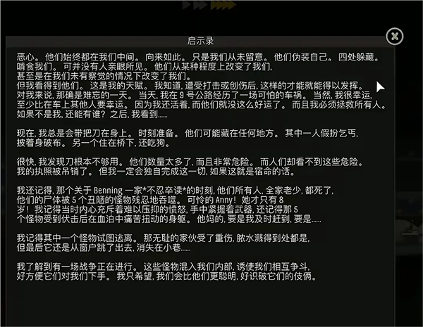 結(jié)局一:世界觀,首次進(jìn)入游戲會(huì)播放一段動(dòng)畫,大意是歐美和東方(個(gè)人感覺就是亞洲)進(jìn)行戰(zhàn)爭(zhēng),但是東方投下了生化武器,大家都變異了,而外出的主角為了活著出去見到女兒必須從一百樓殺出去。