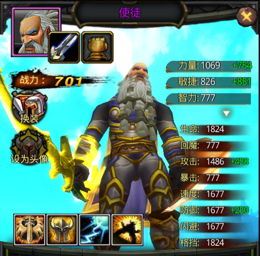 使徒是力量英雄,所以攻擊值由力量點數決定,攻擊:1486(力量點數提供的)+428(武器提供)