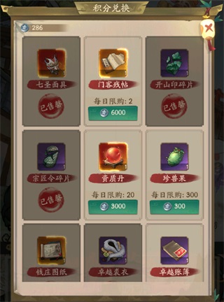商戰(zhàn): 商鋪圖紙買滿,玉佩1個,賬簿和裘衣各(3~5)個,分鐘卡,算盤,人參,可買(1~3)個