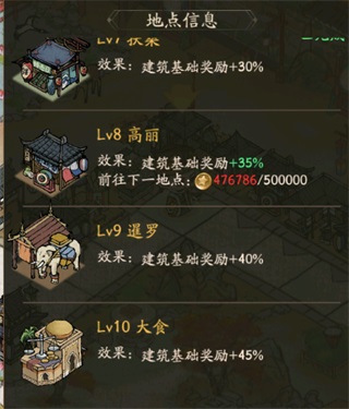 掌柜的金幣數(shù)決定了自己所在的地點等級,等級越高的地點建筑基礎(chǔ)加成越高。