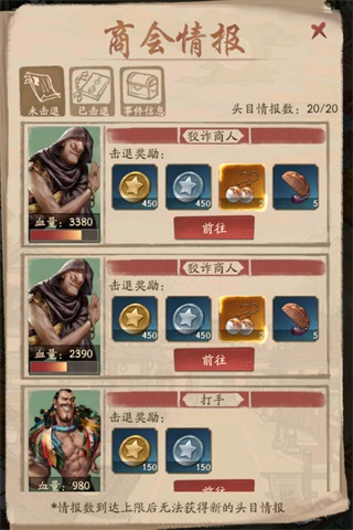 在觸發(fā)全服頭目事件后,因為不同戰(zhàn)力不同,掌柜可自行選擇是否追捕遇到的頭目。若放棄追捕且商會情報未達(dá)上限時,該頭目情報將自動分享至商會情報中。商會內(nèi)的其他掌柜可以擊敗對應(yīng)頭目并獲得對應(yīng)的擊退獎勵哦~