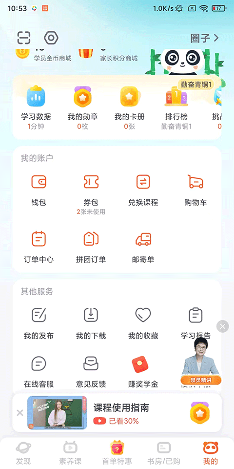 5、購買的課程可以在書房/已購頁中查看,也可以在此頁制定學習計劃,參加話題討論,逛圈子等;