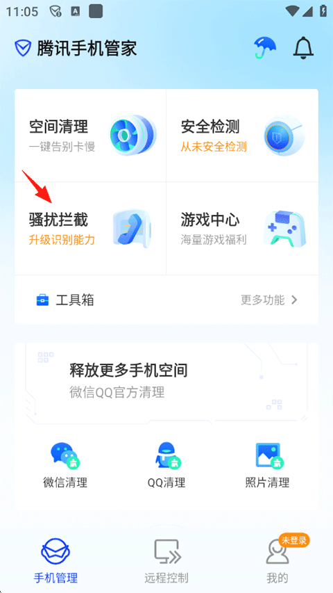 1、打開騰訊手機管家,點擊下方騷擾攔截;