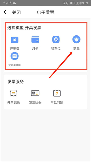 3、進入到電子發(fā)票界面,包括“停車費”、“月卡”“ 租車 位”“商品”和“憑賬單開票”類型,這里以“商品”為例,