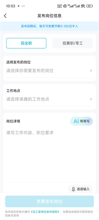 5、選擇發布的崗位、地點、內容點擊發布即可