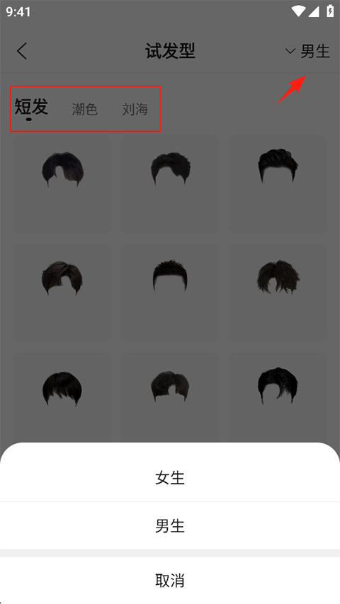2、在右上角點擊切換男生/女生性別,下方選擇發型類別;